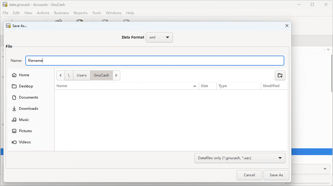 - Select "xml" in "Data Format", and save to export the GnuCash database in XML format