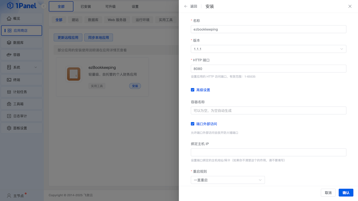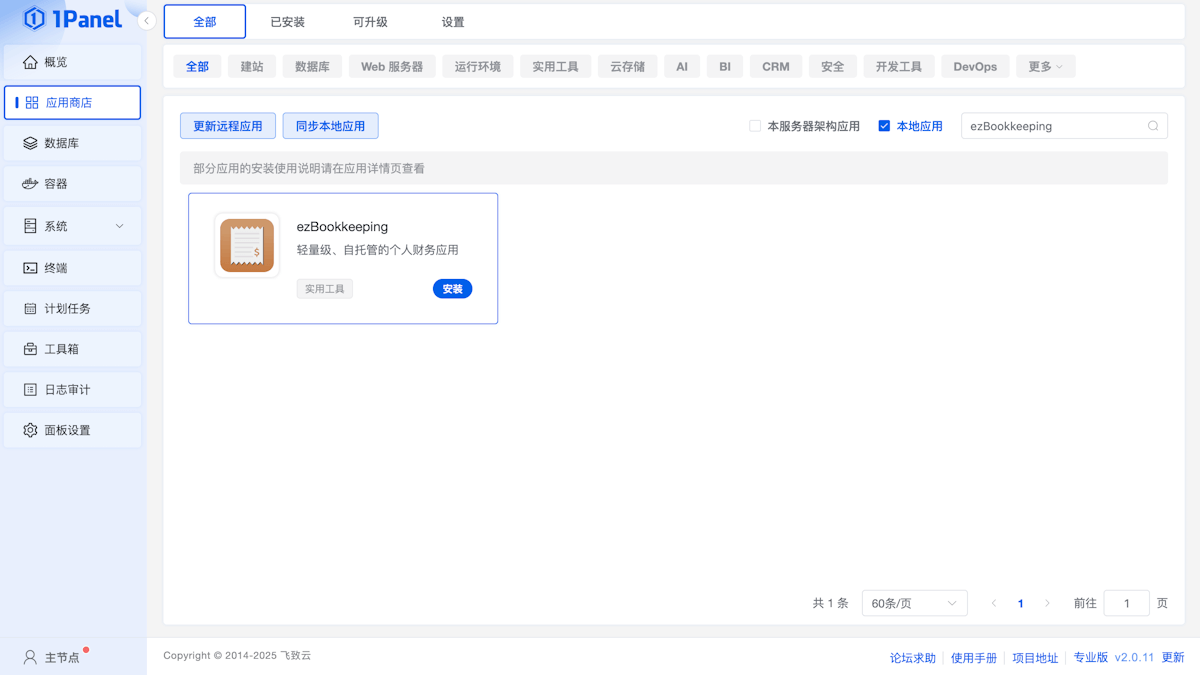 登录 1Panel,进入“应用商店”,搜索“ezBookkeeping”,点击“安装”即可。